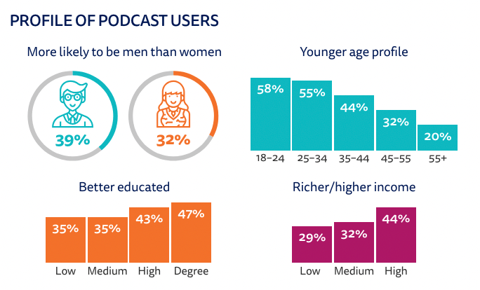 In Sachen Trends rund ums Podcasting geht dieser —und das haben wir jetzt noch mal schwarz auf weiß— bei den Hörenden eher zu männlich, eher jünger, eher besser gebildet und eher besser verdienend (siehe Grafik). Bei immer mehr Publishern im Trend: Podcasts als Ersatz für die Lücke, die soziale Netzwerke seit ihrem Ausbremsen von News hinterlassen haben. Die Vorteile: Podcasts sind günstig(er als Video) und nicht von Algorithmen abhängig. Bei vielen internationalen Formaten setzt sich eine Videofassung durch, die vor allem auf Youtube auch viele Nicht-Podcast-Nutzende erreichen. Sie lernen Podcasting in einer Form kennen, das bisher den Definitionen gar nicht entspricht. Was das bedeutet, habe ich mir vor zwei Wochen in meinem “Future of Podcasts”-Text angeschaut.